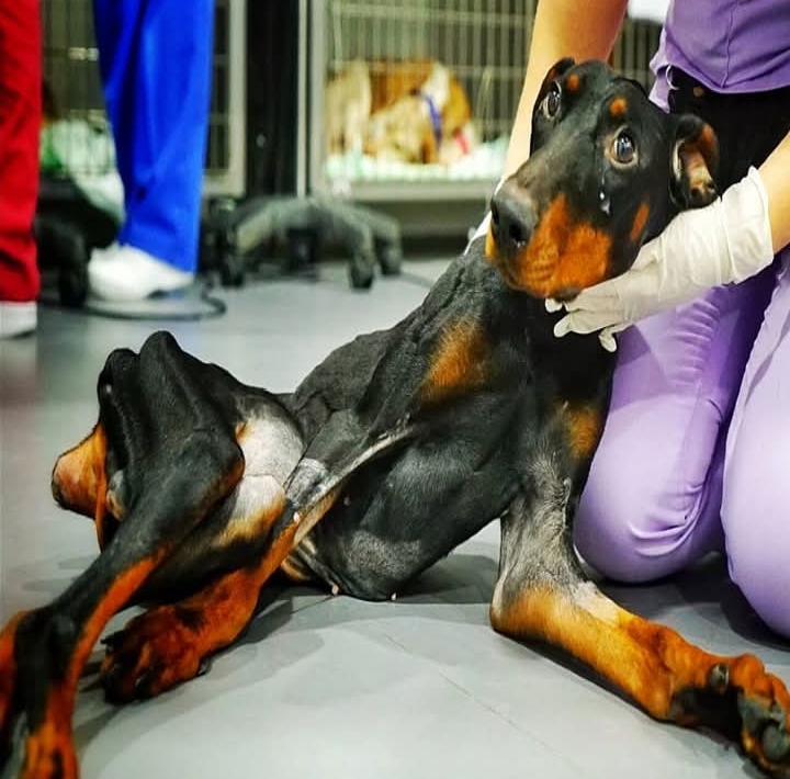 Nancy, a courageous Doberman, found herself abandoned in a junkyard after suffering a brutal beating that left her with a broken back.