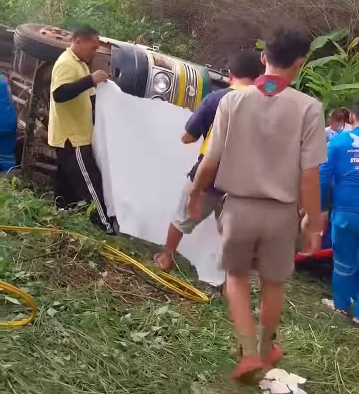 ภาพอุบัติเหตุรถนักเรียนพลิกคว่ำบริเวณ ถนนบ้านห้วยคอม – นาทม อ.เซกา จ.บึงกาฬ