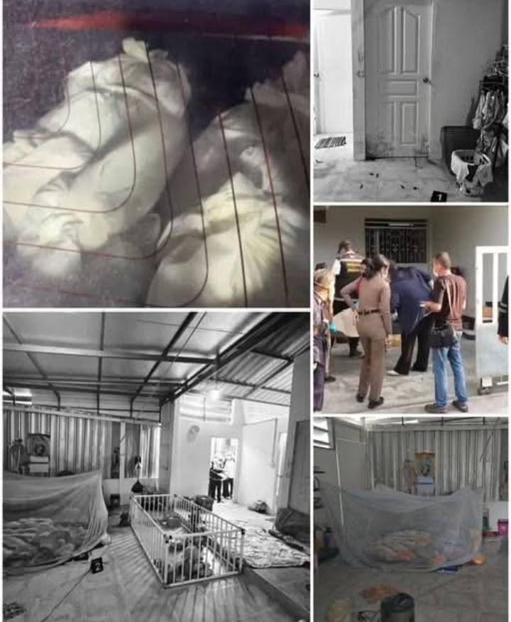 ที่เกิดเหตุ เป็นบ้านชั้นเดียว ภายในบ้านพบศพผู้เสียชีวิตรวม 5 ศพ กระจายไปตามห้อง รายแรกพบเป็นชาย 1 คน ภายในห้องน้ำ ทราบชื่อคือนายสมจินต์ อายุ 62 ปี อยู่สภาพผูกคอตัวเองเสียชีวิต ที่บริเวณฝามือทั้งสองข้างพบคราบเลือดจำนวนมาก ถัดมาที่บริเวณกลางบ้านภายในมุ้งพบนางทัศวรรณ อายุ 60 ปี ภรรยา อยู่ในสภาพนอนคว่ำหน้าเสียชีวิต ถัดมาพบนางน้ำ อายุ 82 ปี แม่ยาย ส่วนภายในห้องนอนพบ น.ส.สุกุลยา อายุ 21 ปี ลูก และเด็กหญิง อายุ 1 ปี เป็นหลาน ทั้งหมดเสียชีวิต มาแล้วไม่ต่ำกว่า 2 วั
