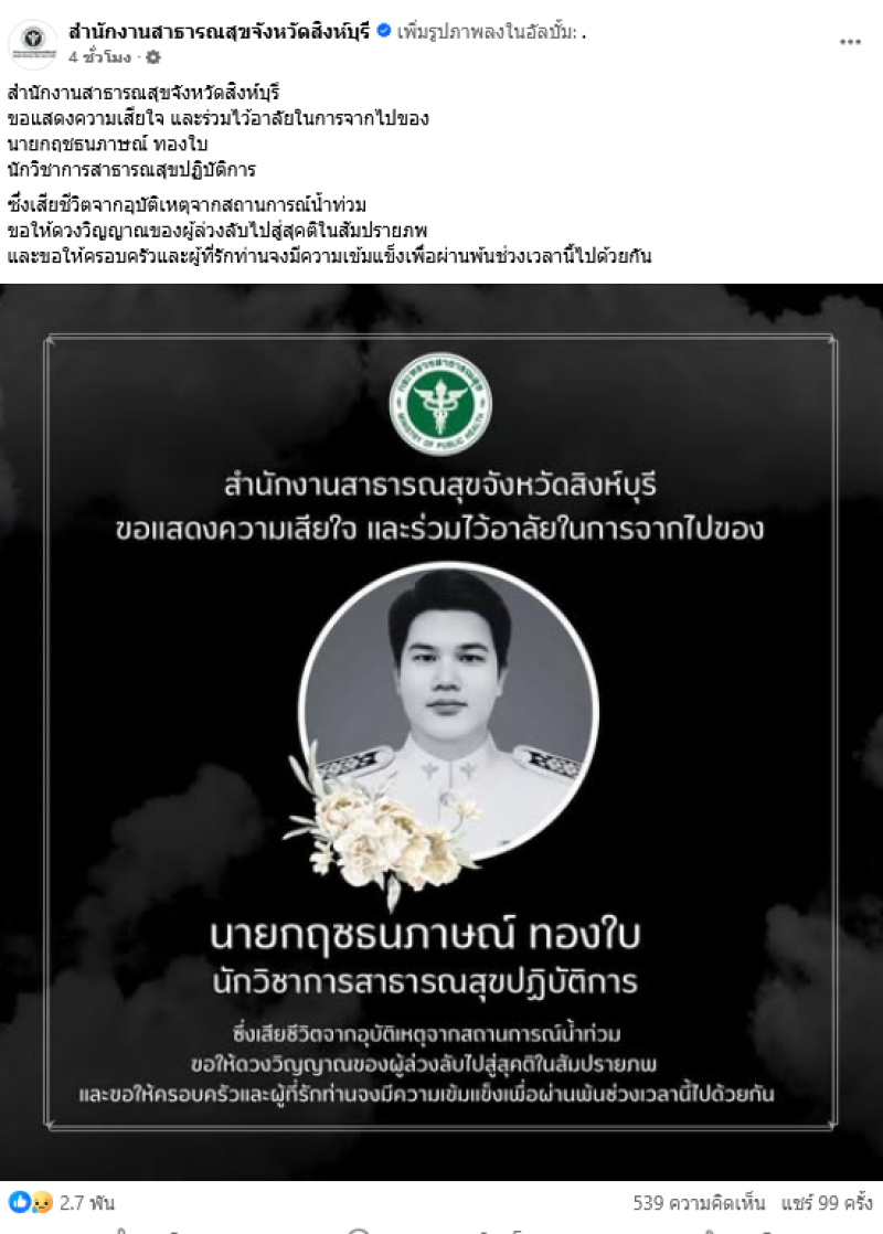 จากกรณี เพจ สำนักงานสาธารณสุขจังหวัดสิงห์บุรี ได้ออกมาโพสต์ข่าวเศร้าโดยระบุว่า สำนักงานสาธารณสุขจังหวัดสิงห์บุรี ขอแสดงความเสียใจ และร่วมไว้อาลัยในการจากไปของ นายกฤชธนภาษณ์ ทองใบ นักวิชาการสาธารณสุขปฏิบัติการ ซึ่งเสียชีวิตจากอุบัติเหตุจากสถานการณ์น้ำท่วม ขอให้ดวงวิญญาณของผู้ล่วงลับไปสู่สุคติในสัมปรายภพ และขอให้ครอบครัวและผู้ที่รักท่านจงมีความเข้มแข็งเพื่อผ่านพ้นช่วงเวลานี้ไปด้วยกัน