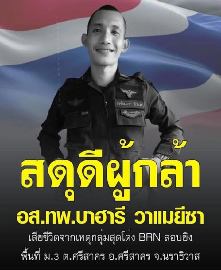 สดุดีผู้กล้า อส.ทพ.บาฮารี วาแมยีซา เสียชีวิตจากเหตุ กลุ่มสุดโต่งBRN ลอบยิง พื้นที่บ้านไอร์กรอก หมู่ 3 ตำบลศรีสาคร อำเภอศรีสาคร จังหวัดนราธิวาส