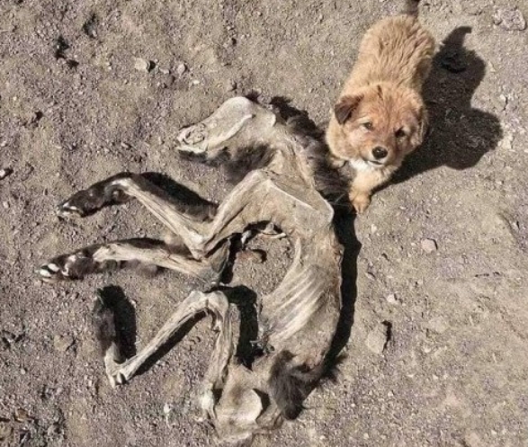 Recently, a series of poignant photos have captured the attention of internet users worldwide. In these images, a solitary puppy is seen sitting near the weathered skeletal remains of another dog, presumed to be its mother.