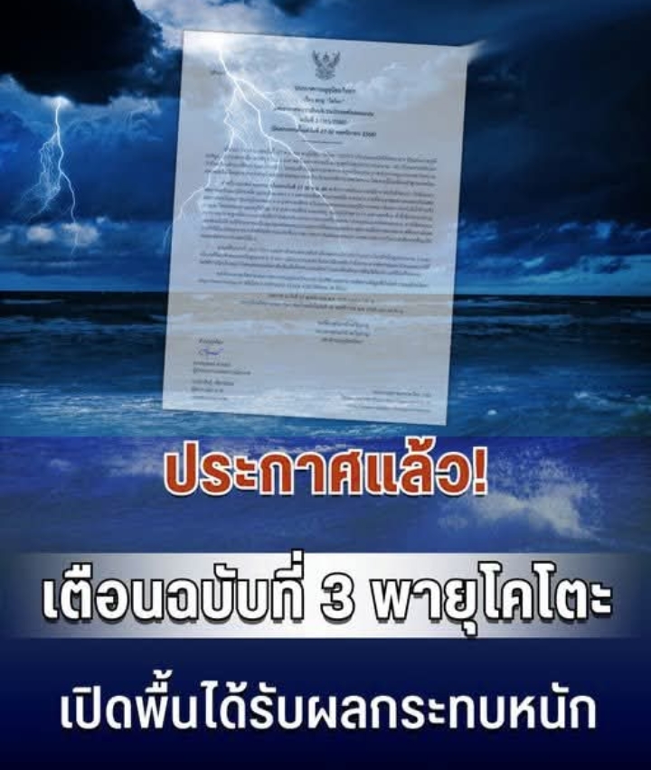 ประกาศแล้ว! กรมอุตุฯ เตือนฉบับที่ 3 พายุโคโตะ เปิดพื้นได้รับผลกระทบหนัก