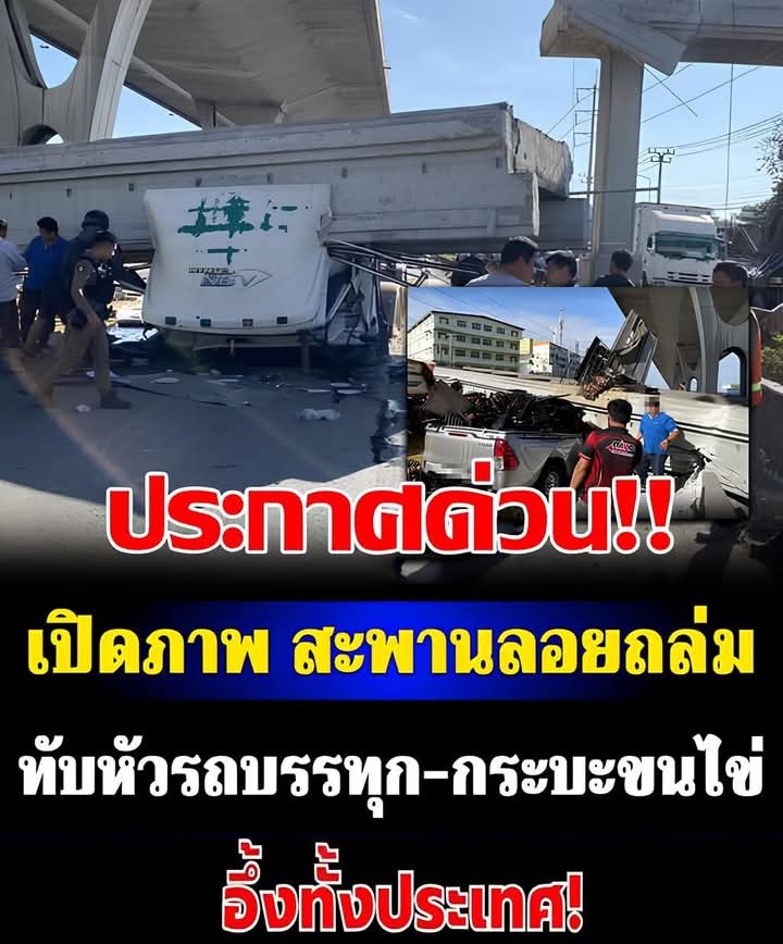 เปิดภาพ สะพานลอยถล่มทับหัวรถบรรทุก-กระบะขนไข่ มีผู้บาดเจ็บหลายราย