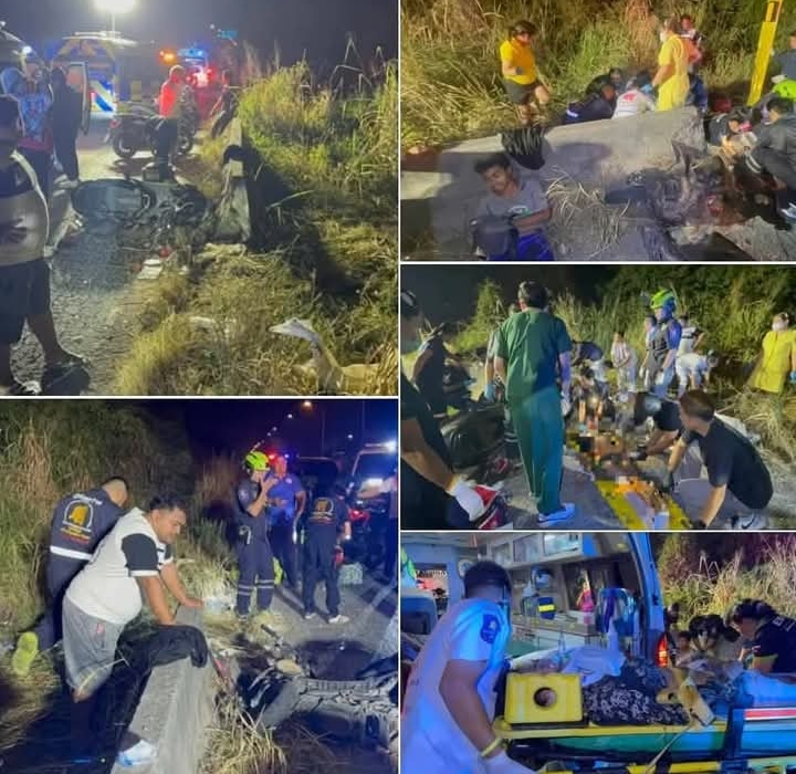 เกิดอุบัติเหตุรถจักรยานยนต์เสียหลักพุ่งชนแบริเออร์ มีผู้ได้รับบาดเจ็บรวม 4 ราย ในจำนวนนี้อาการสาหัส 2 ราย เหตุเกิดเมื่อเวลา 01.06 น. วันที่ 23 ธันวาคม 2568 โดยศูนย์วิทยุหน่วยกู้ภัยสว่างบริบูรณ์ธรรมสถานเมืองพัทยา ได้รับแจ้งเหตุรถจักรยานยนต์ประสบอุบัติเหตุ มีผู้บาดเจ็บหลายราย บนถนนเลียบทางรถไฟ ช่วงระหว่างซอยวัดธรรมสามัคคี มุ่งหน้าซอยเขาตาโล ตำบลหนองปรือ อำเภอบางละมุง จังหวัดชลบุรี หลังรับแจ้งจึงเร่งจัดกำลังเจ้าหน้าที่อาสาสมัครกู้ภัยเดินทางไปตรวจสอบที่เกิดเหตุทันที