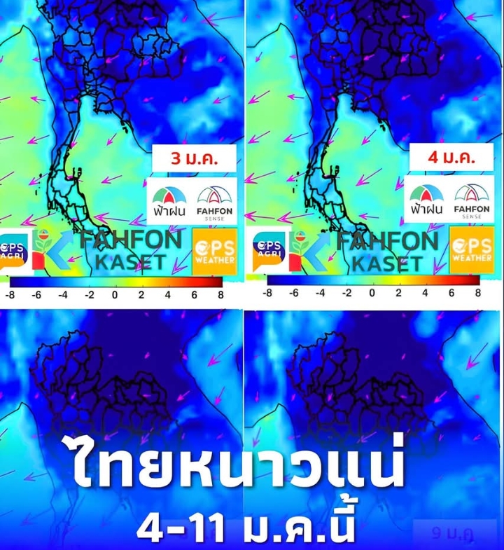 วันที่ 30 ธ.ค. 2568 เพจเฟซบุ๊กซึ่งจัดทำการพยากรณ์อากาศละเอียดสูง โดยบริษัท ซีพีเอส เวเธอร์ จำกัด และ ซีพีเอส อะกริ จำกัด ได้เผยแพร่ภาพคาดการณ์อุณหภูมิในช่วงเวลา 07.00 น. ของแต่ละวัน เปรียบเทียบกับอุณหภูมิของวันที่ 12 พฤศจิกายน ซึ่งใช้เป็นวันอ้างอิง พร้อมระบุข้อความเตือนว่า “เตรียมเย็นลงอีกช่วง 4–11 ม.ค.”