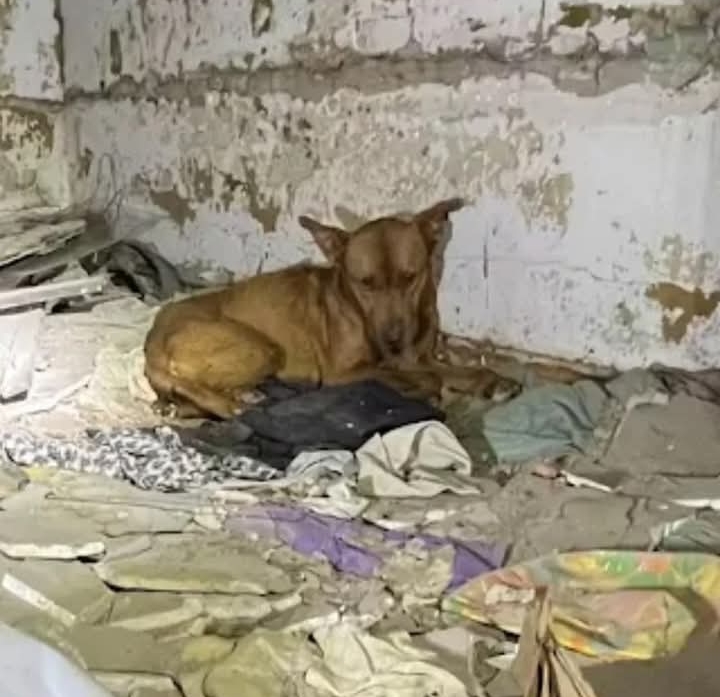 As they combed through the building, the team heard a bark echoing within the dilapidated walls. Lochmann recounted, “There was a poor dog just lying in the rubble of this building.