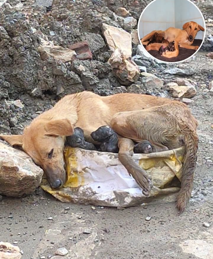A stray dog, struggling to survive after giving birth amidst a pile of debris, was rescued just in time thanks to a compassionate stranger. Her story highlights the harsh realities faced by countless stray animals.