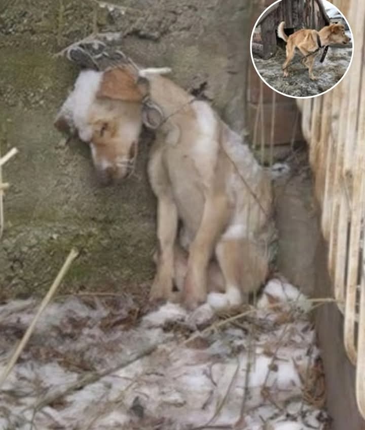 As we made our way through the snow, wrapped in warm coats and scarves, we came across a sight that stopped us in our tracks—a lone dog, chained to a crumbling wall, struggling to stand against the biting cold.