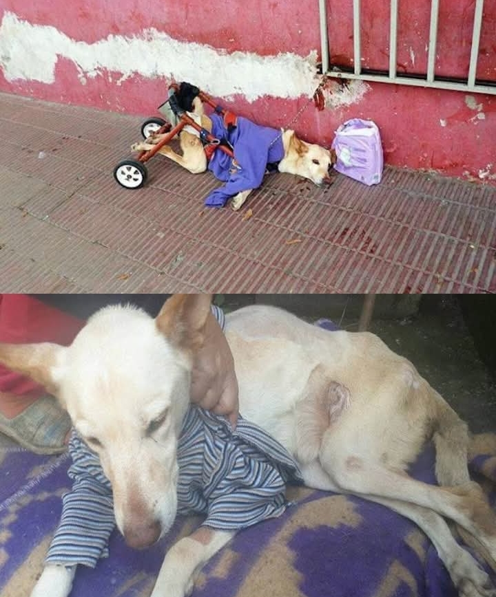 A staff member at a nearby dog care facility noticed Lunetta and was horrified by her condition. Her back legs were strapped to a rusted wheelchair, and she lay helplessly on the pavement with no food or water.