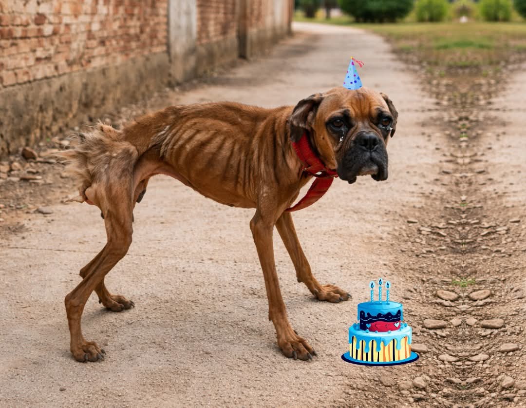 The sight of him was heartbreaking. His skin clung to his fragile bones, his bony frame painfully visible beneath his dull, patchy coat.