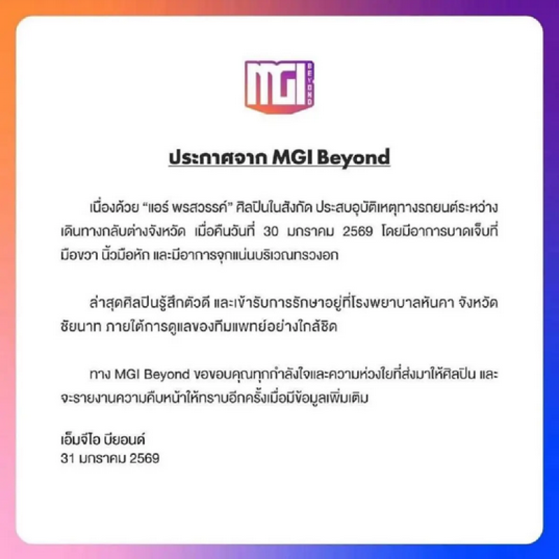 ทั้งนี้ ทาง MGI Beyond ขอขอบคุณทุกกำลังใจและความห่วงใยที่ส่งมาถึงศิลปิน และจะรายงานความคืบหน้าให้ทราบอีกครั้ง หากมีข้อมูลเพิ่มเติม