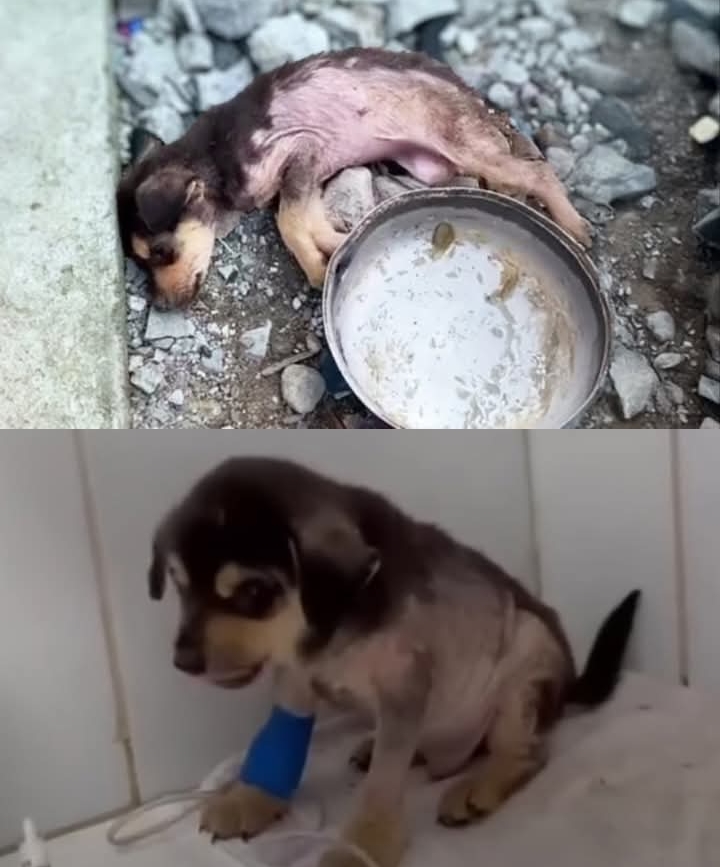 The puppy lay trembling, its frail body barely able to move. Hunger had drained every ounce of strength, leaving it convulsing beside an empty pan, waiting for food that would never come.
